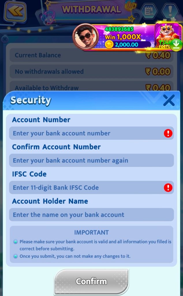 Diwa 777 game app mein aapko bank account kaise setup karna hai chaliye Main yahan per bank account setup karna batata hun doston first mein aapko account number add kar dena vahin FIR dusra mein account number add Karna Hai doston yahan per IFSC code add karke aap per holder name set kar dena Hai doston jo bhi Bank mein aapka naam hoga vah aap yahan per add kar denge uske bad mein niche confirm per click karenge to aapka bank account setup Ho Gaya Hai doston maximum bhi doll aap yahan per ₹100 Le sakte hain petrol yahan per ₹100 Le sakte hain doston is vidroh se aap apne Jo game hai usmein add bhi kar