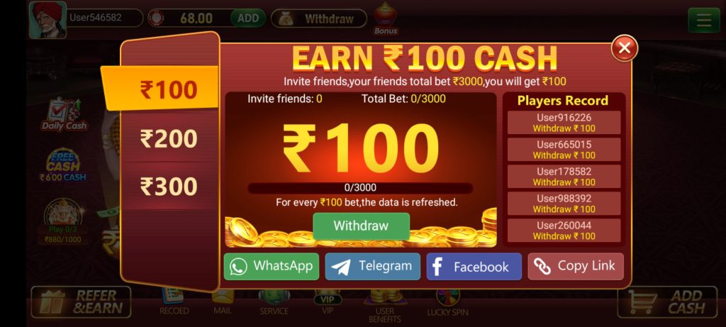 दोस्तों इस एप्लीकेशन में ₹600 फ्री कैसे दिया गया है आपको फ्री कैश कैसे लेना है चलिए मैं बताता हु फ्री कैश लेने के लिए आपको अपने फ्रेंड के पास शेयर करना होगा फास्टेस्ट ₹100 दिया जाएगा और दूसरा बार ₹200 दिया जाएगा तीसरा बार ₹300 दिया जएगा तो आप देरी न करें जल्दी से जल्दी इस गेम को डाउनलोड करें जिसका नाम ind bet game download apk हैं