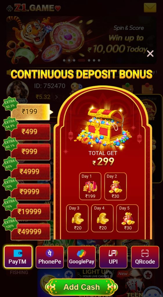 doston is application mein agar aap deposite karte hain to aapko dher Sara rupya bonus dekhne Ko mil jaega doston aapko dikhta hoga doston yahan per dekh sakte hain aap log agar yahan per 199 rupaye deposite karte hain to aapko yahan per ₹10 extra bonus milega doston yahan per 7 din tak le yahan per click karne ke liye aapko milta hi rahega application mein kafi jyada loot bonus Diya Gaya hai doston aap deposite ko bhi bonus loot sakte hain doston aur yahan per karte hain vahan bhi aap loot sakte hain bonus doston application kafi badhiya work kafi behtarin application hai ek bar jarur TRAI karenge doston yahan iska application ka name Z1 game apk